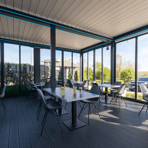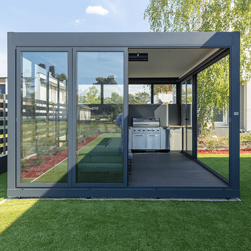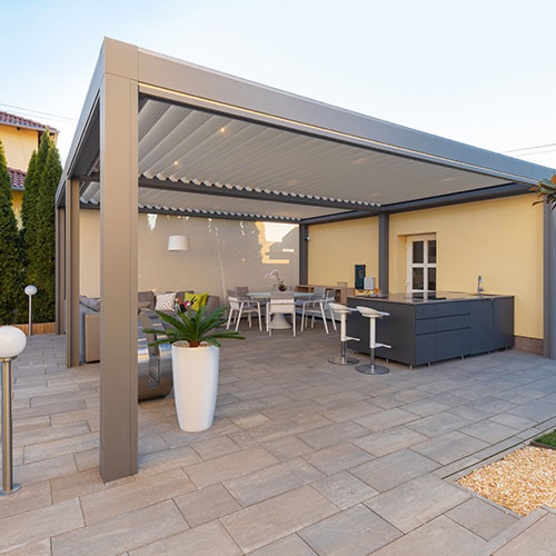 A bioklimatikus pergola egy intelligens árnyékolórendszer, amely alumínium lamellák segítségével szabályozza a napfényt és a levegő áramlását. A lamellák 0°-tól 135°-os szögig dönthetők, így napszaktól függően beállíthatja az ideális klímát és fényviszonyokat.